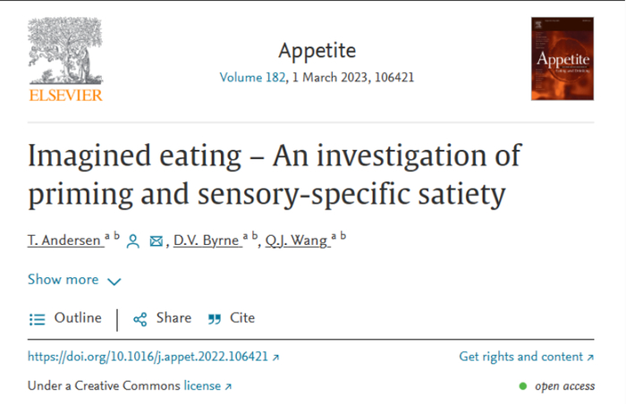 基于扎根认知论(grounded cognition theory),丹麦奥胡斯大学(Aarhus University)的博士生Tjark Andersen展开了一系列研究,结果表明:如果我们将同一幅美食图像看 30 次以上,就会产生饱腹感。也就是说我们的认知感知(cognitive perception)即我们对食物的看法会显著影响食欲。相关成果以“Imagined eating – An investigation of priming and sensory-specific satiety”为题,于2023年5月1日发表在Appetite期刊。