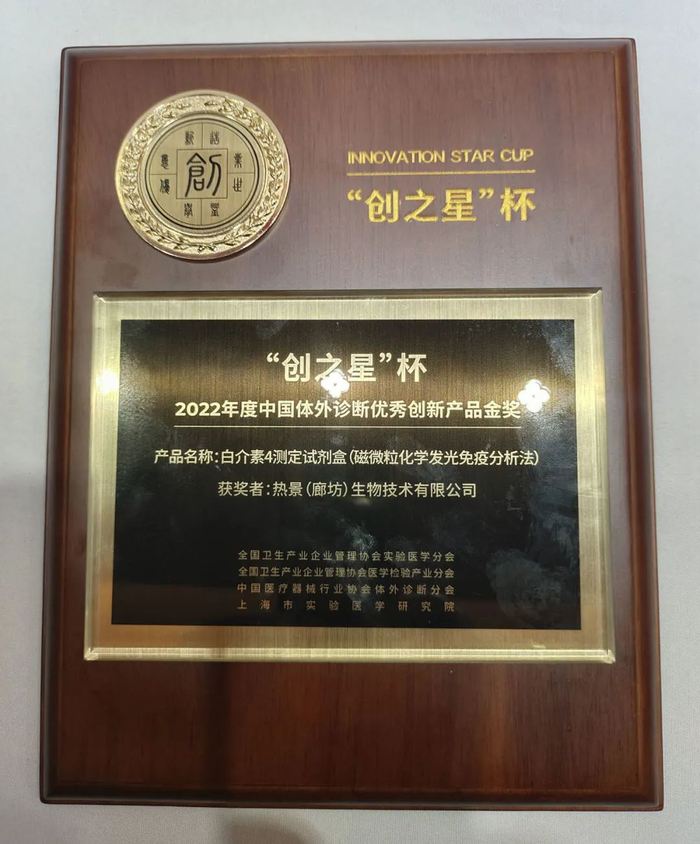 在5月27日“创之声”第八届中国实验医学大会现场,热景生物旗下热景(廊坊)生物技术有限公司生产的专有特色细胞因子系列产品,荣获2022年度“创之星”杯中国体外诊断优秀创新产品金奖。
