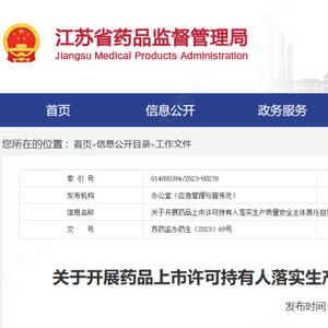 2023年05月30日,江苏药监局发布了《关于开展药品上市许可持有人落实生产质量安全主体责任自查自纠工作的通知》,要求自查自纠工作6月底结束,各持有人应于7月15日前将自查自纠结果上报“江苏省药品生产监管系统。
