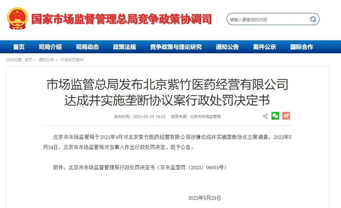 《北京市市场监督管理局行政处罚决定书(京市监垄罚〔2023〕06001号)》原文见:因为这个药品,紫竹医药领千万罚单