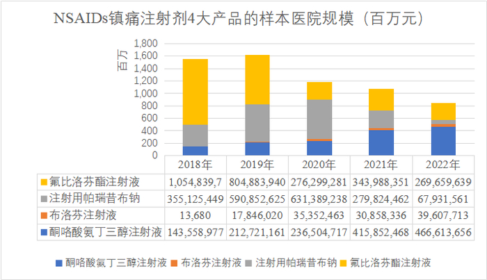 NSAIDs市场竞争激烈,11款大品种尽收国家带量采购。其中用于术后镇痛的NSAIDs注射剂大品种已尽数纳入:氟比洛芬酯注射液、布洛芬注射液、注射用帕瑞昔布钠、酮咯酸氨丁三醇注射液。