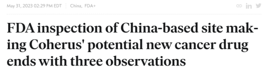 Coherus在提交给SEC的文件中表示:“公司认为,在FDA检查结束时收到的三项意见是可以解决的,并计划与君实生物一起在6月初向FDA提交答复。”不过该公司没有披露这些观察结果。