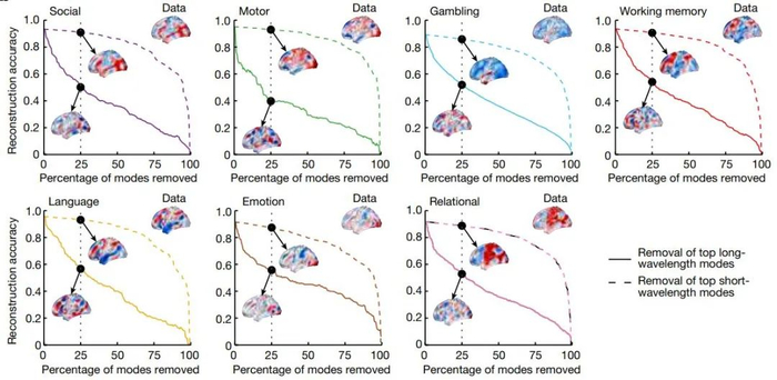 研究人员将神经科学、心理学的方法与物理学、工程学的方法相结合,利用fMRI实验数据构建大脑的本征模式(eigenmode)——这一物理学术语原本用于描述一个系统的天然振荡模式。借用这一术语,研究人员探索了大脑系统的神经活动动力学如何受其结构的约束。