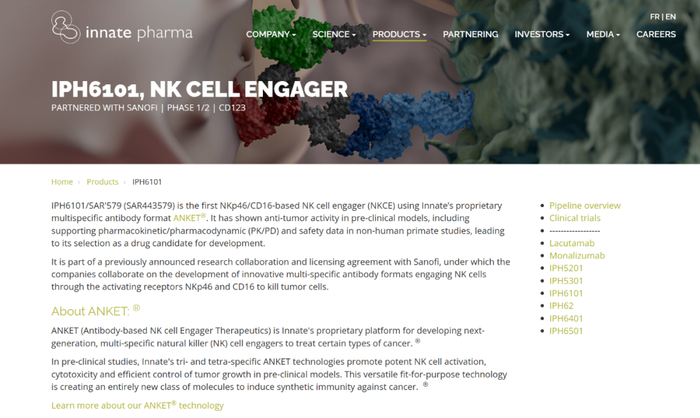 据悉,SAR443579是赛诺菲与Innate Pharma合作开发的,利用Innate专有的多特异性抗体平台ANKET研发的一款基于NKp46/CD16的NK细胞接合器,拟开发用于复发或难治性急性髓系白血病(R/R AML)、B细胞急性淋巴细胞白血病(B-ALL)或高风险骨髓增生异常综合征(HR-MDS)患者,目前处于临床I期研究阶段。