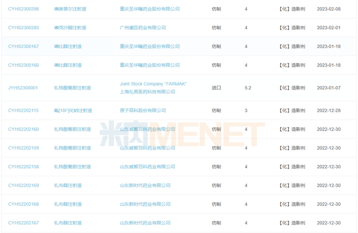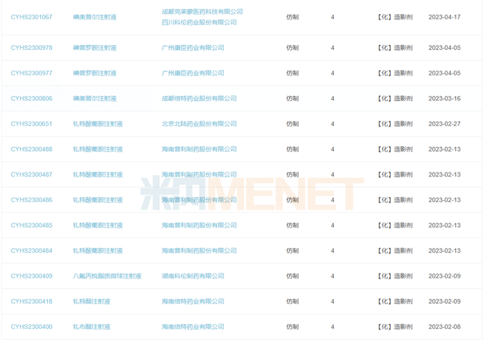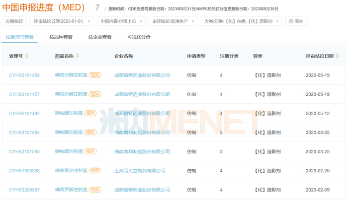 今年以来,有4个造影剂(7个受理号)获批上市,数量已超过2022年全年。其中,司太立的碘美普尔注射液以仿制4类报产获批,拿下国内首仿。