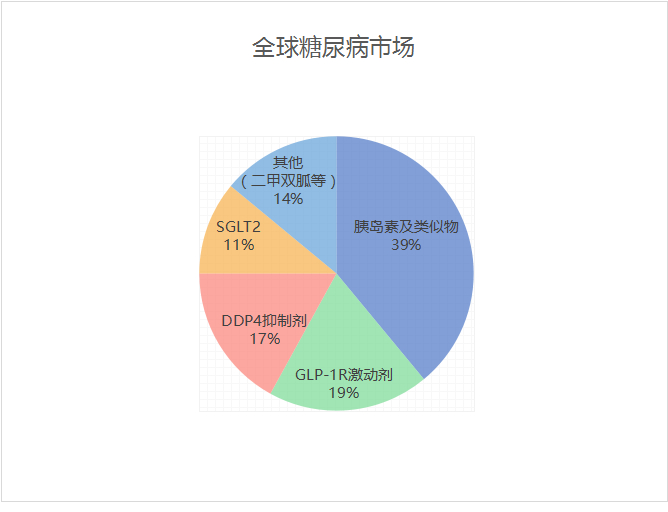 纵观全球糖尿病药物销售市场,除胰岛素占据大市场外,非胰岛素药物主要是以 GLP-1、DPP4和 SGLT2 为代表的新型药物。值得注意的是,GLP-1进入了高速增长阶段,有机会超越胰岛素类占据大市场。