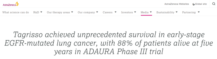 6月4日,阿斯利康在美国临床肿瘤学会(ASCO)年会上首次公布了第三代EGFR抑制剂Osimertinib/奥希替尼(英文商品名Tagrisso)作为辅助疗法,治疗早期(IB,II和IIIA期)携带EGFR突变的非小细胞肺癌(NSCLC)的Ⅲ期临床试验ADAURA的积极结果。数据显示,奥希替尼显著改善患者的生存期,5年生存率达88%。使用辅助药物Tagrisso进行治疗可将死亡风险降低一半以上(51%),这个数据相当震撼,是“前所未有的”。
