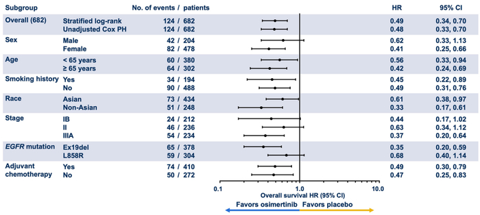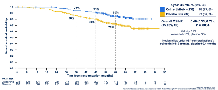 该研究基于中位数5年(60个月)的随访,手术后使用奥西替尼与安慰剂相比显著改善了总生存期(OS)。在II期至IIIA期患者中,奥希替尼降低了51%的死亡风险(HR 0.49, 95% CI [0.33, 0.73];P = 0.0004),奥西替尼组85%的患者存活至5年,而安慰剂组为73%。