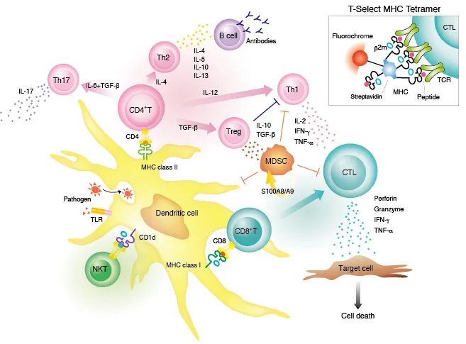 在T细胞上表达的T细胞受体(TCR)特异性识别并结合MHC-肽复合物。MHC四聚体试剂不仅可以直接检测抗原特异性T细胞,还可以通过抗原识别用于分离特异性T细胞,从而能够详细分析抗原特异性T细胞功能和表型。MHC四聚体广泛应用于基础和临床研究,如细胞免疫治疗,移植免疫,自身免疫疾病以及传染病和癌症疫苗治疗等领域。