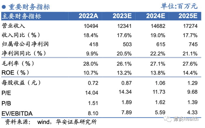 润达医疗是全国领先的检验科战略合作伙伴,通过多年深耕IVD供应链服务及实验室综合服务,具备系统化自主产品开发能力系统化的IT开发服务能力、完备的工程师服务团队体系,持续获得客户的认可。公司本次与华为云签署全面战略合作协议,将进一步以大数据、云计算、人工智能等信息技术为基础,赋能传统检验服务向精细化、信息化、智慧化的方向升级,帮助医院客户进一步降本增效,同时向C端用户的使用场景探索,加速构建润达的纵深护城河。我们看好公司医院检验科战略合伙人的战略定位和稀缺的能力,预计2023~2025年公司将实现营业收入123.41/146.82/172.74亿元人民币,同比+17.6%/19.0%/17.7%;实现归母净利润5.03/6.15/7.45亿元人民币,同比+20.5%/22.2%/21.1%;对应P/E 14/12/10x。维持“买入”评级。