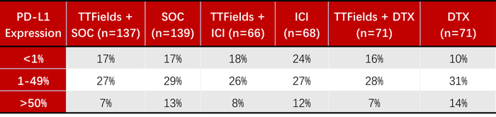 随机接受TTFields和多西他赛(n=71)治疗的患者具有积极的生存趋势,中位OS为11.1个月,而单独接受多西他赛治疗的患者(n=71)为8.7个月。