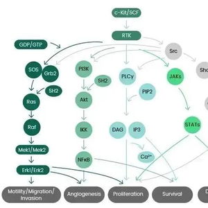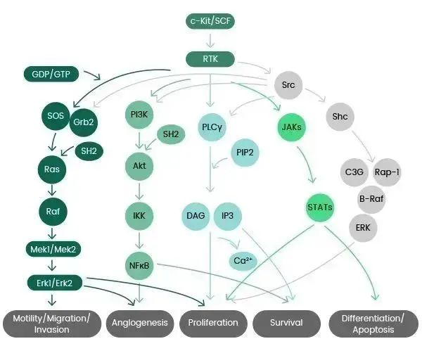 c-Kit磷酸化触发多种信号转导通路,包括JAK/STAT、RAS/MAP激酶通路、PI3激酶、PLCγ通路和SRC通路。一旦c-Kit被激活,细胞存活、增殖、分化和迁移就会发生,这需要这些通路的重叠。自磷酸化后,c-Kit被SOCS6迅速泛素化,导致内化和降解。