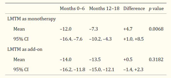 单药或组合药治疗第0-6个月和第12-18个月全脑萎缩年化率比较(cm3)。(图片来源:Journal of Alzheimer's Disease)