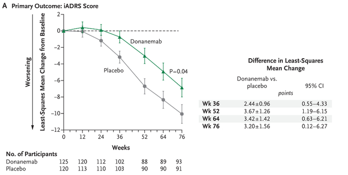 Donanemab治疗的AD患者iADRS评分。(图片来源:The New England Journal of Medicine)