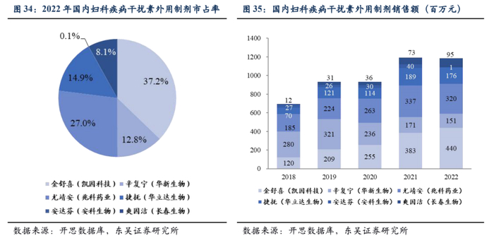 目前治疗妇科疾病的干扰素外用制剂主要剂型有泡腾片(凯因科技的金舒喜)、凝胶(兆科药业的尤靖安)、泡腾胶囊(华新生物的辛复宁)、喷雾剂(天津未名的捷抚)以及栓剂(长春生物爽因洁、安科生物安达芬)。这5种不同剂型的6家企业的产品间规格用法有所不同,单价差异较大。根据开思数据库, 2018年到2022年金舒喜的市场份额稳步上升,2022年金舒喜的市占率达到了37.2%,位居行业第一。