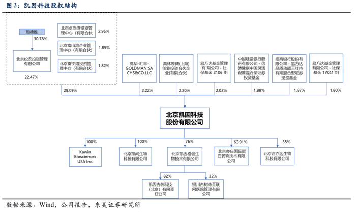 根据公司一季报披露,截至2023年3月31日,凯因科技的最大股东为周德胜博士实际控制的北京松安投资管理有限公司,周博士持有公司股份为30.78%。公司没有其他持股占比超过5%的股东,卓尚湾、富山湾、富宁湾为控股股东松安投资的一致行动人。公司流通股本占总股本的69.28%,具有良好的流动性。