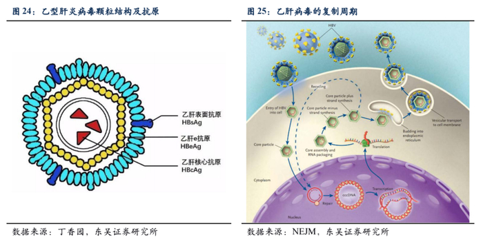 核苷(酸)类药物的作用在于抑制乙肝病毒复制过程,能够快速降低血清中的乙肝病毒复制中产生的DNA水平(即降低HBV DNA水平)。但由于核苷(酸)类药物无法清除受感染肝细胞,受感染肝细胞还会不断表达HBsAg和HBeAg等抗原,肝脏会进一步受损。此外,停药后,乙肝病毒复制及ccc DNA的表达仍会发生反弹,难以实现安全停药,通常需长期服药。而长效干扰素在直接抑制乙肝病毒复制强度方面弱于核苷(酸)类药物,但其通过激活人体免疫系统,清除受感染的肝细胞,真正抑制cccDNA的表达,从而根本上降低体内HBsAg和HBeAg的水平,大幅度降低未来肝癌发生风险,从而获得更高临床治愈率,降低重症化发生风险。在降低HBsAg和HBeAg的水平到一定程度(实现血清学清除甚至转化)后,人体自身免疫系统已能够建立起相对稳定的持续应答,可实现安全停药。