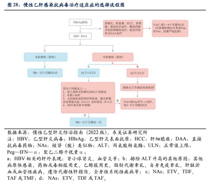 上述两类药物在针对乙肝治疗侧重点上存在显著差异,所以并不构成完全替代竞争关系,目前都是慢性乙型肝炎防治指南的一线推荐药物。国内指南强调对于初始治疗患者,首选强效低耐药的核苷(酸)类药物,推荐ETV、TDF、TAF和TMF。对于治疗中患者,应定期检测HBV DNA定量,以便及时发现病毒学突破、低病毒血症及应答不佳者,并尽早给予挽救治疗。对NAs经治CHB患者中符合条件的优势人群,联合Peg-IFN-α可使部分患者获得临床治愈。多项研究显示,干扰素治疗前 HBsAg低水平(<1 500 IU/ml)且 HBeAg阴性的优势患者接受序贯Peg-IFN-α治疗更有可能实现临床治愈,同时Peg-IFN-α可能降低HBV相关HCC发生率,使用疗程为48周,可以根据病情需要延长疗程。