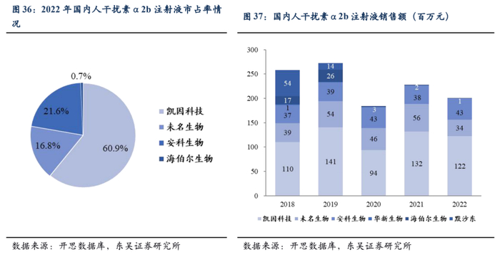 该药物已被纳入《国家基本药物目录(2018年版)》和《国家基本医疗保险工伤保险和生育保险药品目录(2020年)》。据开思数据库数据显示,自2019年以来,凯因益生在国内人干扰素α2b注射液市场上的市场份额持续领先,超过50%,且呈现稳健上升趋势。到2022年,凯因益生的市场份额达到了60.9%,稳居细分市场第一。