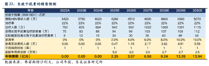 根据上述慢性乙肝患者总人数、诊断率、用药人群占比和疗程费用的情况,我们预计凯因科技的长效干扰素在2025年营收为2.35亿元,并逐渐上升至2030年的13.94亿元。
