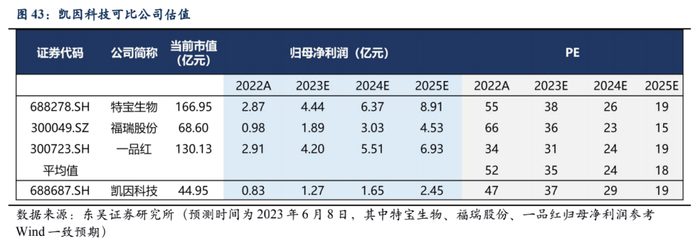 病毒性肝炎市场规模受政策助力高速增长,未来空间广阔。作为国内首家成功开发出泛基因型全口服丙肝治疗药物组合的企业,凯因科技旗下多种上市商业化药物持续贡献利润,可洛派韦销售额爬坡影响逐步消除、长效干扰素成功上市后有望带来业绩爆发。我们预计公司将在2023年至2025年取得营业收入分别为14.34亿、18.05亿、26.40亿元,归母净利润分别为1.27/1.65/2.45亿元,对应当前市值的PE为37X/29X/19X。选择同为医药行业的特宝生物(干扰素)、福瑞股份(肝病领域)、一品红(肝病领域)为可比公司,采用可比公司PE相对估值法进行估值。公司当前股价对应2023年PE为37倍,与可比公司PE平均值几乎持平。首次覆盖,给予“买入”评级。