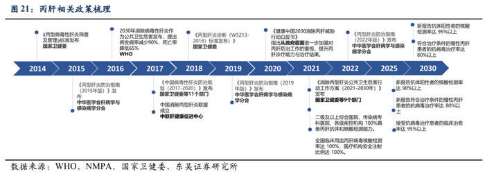 国家多项政策推动丙肝治疗进程。2016年,世界卫生组织(WHO)提出 2030 年消除病毒性肝炎作为重大公共卫生威胁的总体目标。我国于 2014 年出台了《丙型肝炎筛查及管理》标准,于2017年出台了《中国病毒性肝炎防治规划(2017-2020)》的战略性文件。于 2021 年 7月出台了《健康中国 2030 消除丙肝威胁行动白皮书》。除此之外,中华医学会肝病学与感染病学分会于2015年发布了《丙型肝炎防治指南(2015年版)》并于2019年、2022年两度更新指南。