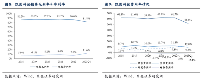 销售方面,公司与资质齐全、覆盖范围广的医药经销企业进行合作,形成覆盖全国的流通体系。除了与合同销售组织(CSO)进行合作,由 CSO 负责专业化学术推广及服务外,2021年,公司开始针对复苷产品扩展商业销售模式,药店、诊所及中小终端的覆盖数量明显提升;同时,公司围绕新产品组建了专业化的学术推广队伍,快速推进新产品的临床应用。2018-2023年Q1公司主营业务毛利率整体呈平稳趋势,维持在85%左右,2023Q1销售毛利率稍有下降。而公司销售净利率稳步提升,并在2023Q1达到了11.6%。2018-2022年销售费用率维持在60%左右,2023年Q1有明显下降。长期来看,由于近两年公司新药上市需要前期投入推广,销售费用率较高。随着未来新药不断放量,预计销售费用率能够逐年摊薄。管理费用率、研发费用率近三年保持在10%左右,财务费用率维持负数,表明企业近五年经营策略稳健。
