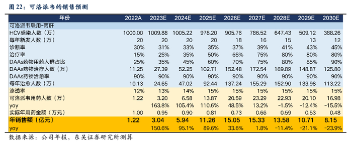 假设2022年HCV患者为1000万人,每年新发患者为20万人,并从2025年开始以每年减少10%的速度变化。根据流行病学数据及 2030 年消除丙肝威胁的目标,假设 HCV诊断率从 2022年的30% 提升到45% ,治疗率从 15% 迅速提升到 80% ,直接抗病毒 DAA 治疗方案的整体市场占有率从目前的25%提升到90%。可洛派韦 2020 年获批上市,2020年底医保谈判纳入医保目录。2022 年后,医保目录持续更新,竞争环境愈发激烈,假设市场占有率缓慢提升并维持在15%。可洛派韦在2022年底医保谈判续约时仅降价5%,同时获得适应症扩大,2023、2024每年降价5%,之后每年降价10%。