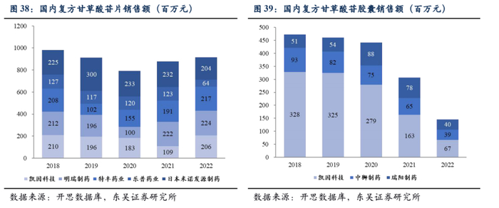 公司的复方甘草酸苷产品在2019年被纳入《国家基本医疗保险、工伤保险和生育保险药品目录(2020年)》,属于国家乙类医保产品。其中,凯因甘乐获得了“北京新技术新产品”称号,甘毓生产线通过了乌克兰GMP认证(PIC/S标准)。目前,主要生产复方甘草酸制剂的剂型为片剂和胶囊。据开思数据库显示,制造片剂的企业包括日本米诺发源制药株式会社、凯因科技、明瑞制药、乐普药业和特丰药业,而制造胶囊的企业包括凯因科技、瑞阳制药和中狮制药。从开思数据库的药物竞争格局来看,复方甘草酸苷产品各品种市场份额已基本稳定。我们预测,公司复方甘草酸苷产品的未来收入将保持稳定。