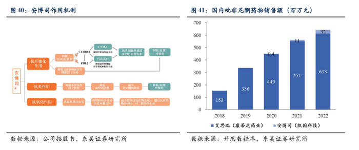 吡非尼酮片的原研药为日本盐野义制药株式会社研发的Pirespa。Pirespa于2008年10月在日本申请上市,但未在中国上市销售。2019年,吡非尼酮全球销售额达到11.29亿瑞士法郎,约合人民币78亿元。截至2023年3月,在中国获批的吡非尼酮产品厂商只有两家:凯因和康蒂尼药业。康蒂尼药业的产品艾思瑞是一类新药,用于治疗轻度至中度IPF。根据米内网数据,2019年艾思瑞市场销售额达到3.28亿元人民币。而根据开思数据库数据,安博司上市后迅速放量。考虑到罕见病市场仍存在大量未满足的治疗需求以及新冠患者肺部纤维化后遗症预期,我们认为该药物未来放量潜力可观。
