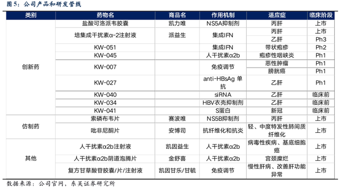 目前,公司已有多种药物在销,包括盐酸可洛派韦胶囊(凯力唯)、培集成干扰素α-2注射液(派益生)、人干扰素α2b阴道泡腾片(金舒喜)、人干扰素α2b注射液(凯因益生)、复方甘草酸苷胶囊(凯因甘乐)、复方甘草酸苷片/注射液(甘毓)和吡非尼酮片(安博司)等。当前,公司以现有抗病毒领域治疗药物的生产及销售为基础,积极开展以创新药为核心的乙肝功能性治愈药物组合自主研发,逐渐成长为国内病毒性疾病治疗领域的领先力量。