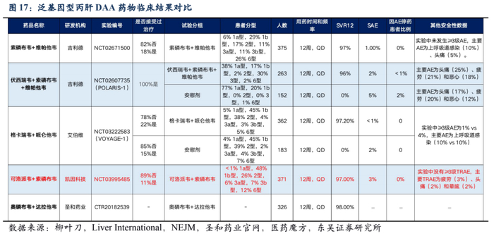 公司是国内首家成功开发出丙肝高治愈率泛基因型全口服系列药物——盐酸可洛 派韦胶囊的企业。公司采用可洛派韦(凯力唯)和索磷布韦(赛波唯)联用方案治疗 丙肝,可洛派韦的作用靶点为 NS5A,索磷布韦的作用靶点为 NS5B。该方案可治疗初 治或干扰素经治的基因 1 型、2 型、3 型、6 型成人慢性丙型肝炎病毒(HCV)感染, 覆盖目前主要基因型,并且可以治疗具有代偿性肝硬化的患者,是我国首个国产丙肝 泛基因型全口服系列药物。整体临床治愈率高达 97%,用药周期仅为 12 周,用药方案 简单(每日一粒盐酸可洛派韦胶囊+一片索磷布韦片),患者依从性高。药物不含蛋白 酶抑制剂,有效避免频繁出现药物的相互作用(DDI),能够合并多种用药。且药物无 需频繁检测肝功能,无需进行基因分型,对无条件进行基因分型检测的广大基层患者 更友好,可实现全员治疗、简便易行、基层可及。