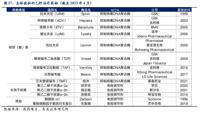 现阶段针对慢性乙型肝炎(CHB)感染治疗的药物主要有两大类,第一类是核苷(酸)类似物(NAs),包括拉米夫定(LAM)、阿德福韦(ADV)、恩替卡韦(ETV)、替比夫定(LdM)、克拉夫定、替诺福韦二吡呋酯(TDF)、替诺福韦艾拉酚胺(TAF)、贝西福韦和艾米替诺福韦(TMF)等药物。第二类是长效干扰素,包括普聚乙二醇干扰素α-2a和聚乙二醇干扰素α-2b等。除此外还有胸腺肽-α1和重组细胞因子基因衍生蛋白这类免疫调节剂可用于慢性乙肝的治疗。