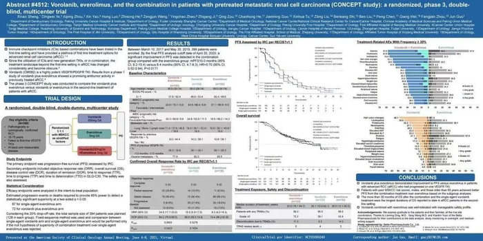 其中,伏罗尼布的2/3期注册性临床试验(CONCEPT研究)由北京肿瘤医院郭军教授牵头,中国共计36家医院共同参加。该研究目的是评估伏罗尼布联合依维莫司治疗肾癌患者的疗效和安全性,共399例患者随机接受伏罗尼布+依维莫司、伏罗尼布单药或依维莫司单药治疗,每组133例。该研究结果已在2021年美国临床肿瘤学会(ASCO)年会上公布。