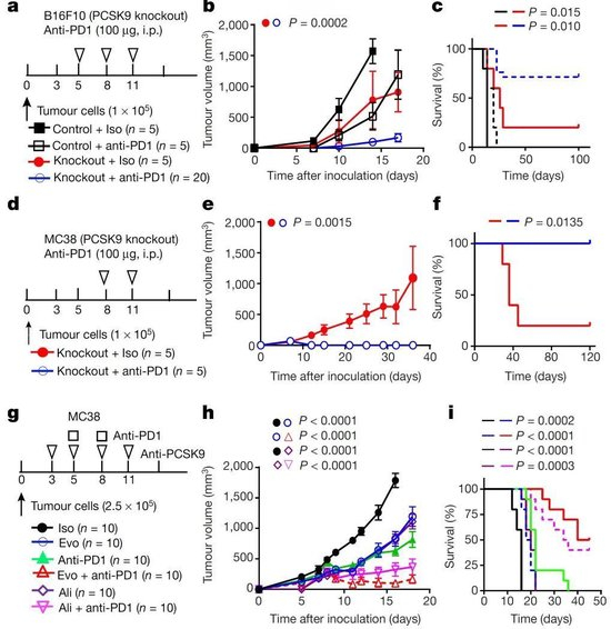 在小鼠肿瘤模型中,PCSK9 的敲除可与 PD-1 抗体协同抑制致肿瘤生长(图 a-f)。利用已获批的 PCSK9 单抗阿利西尤单抗和依洛尤单抗对 MC38 荷瘤小鼠进行处理后,也观察到了类似结果(图 g-i)。