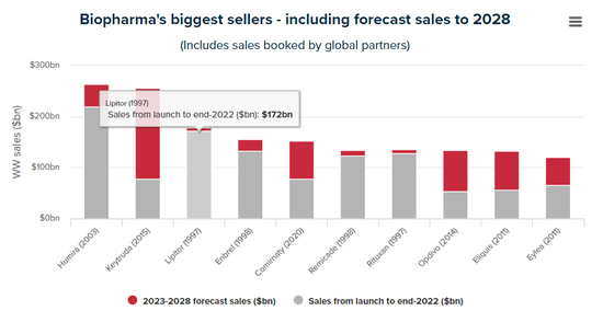 阿托伐他汀作为第三代他汀类药物的典型代表,是修美乐和 K 药之前曾创下传奇的初代‘药王’。它是历史上第一个销售额超百亿美元的药物,且在 2011 年专利到期前曾创下连续 8 年销售额超过百亿美元的记录。截至 2022 年,累积销售额高达1720 亿美元。