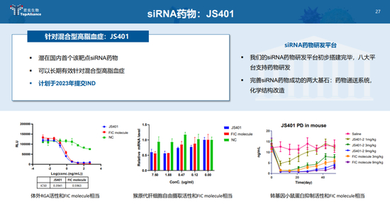 siRNA 等核酸类药物也是国内企业正在布局的方向,潜力新靶点ANGPTL3备受关注。君实生物已经初步完成 siRNA 药物研发平台搭建,首发新药 JS401于今年 4 月 13 日申报临床,可用于治疗混合型高脂血症。