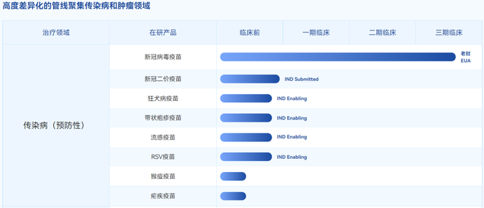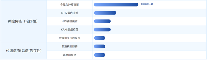 基于斯微生物的技术平台,公司同步开展了多个治疗领域的应用(肿瘤免疫学,传染性疾病等)和20余条产品管线的开发。个性化肿瘤疫苗管线已经在澳洲开展临床Ⅰ期,并已同步在国内多家医院开展IIT研究,是国内第一家进入临床研究和Moderna、BioNTech 相媲美的个性化肿瘤疫苗。编码细胞因子IL-12的非复制mRNA瘤内注射剂SW0715的新药临床试验申请已经获得中国国家药监局药品审评中心受理。