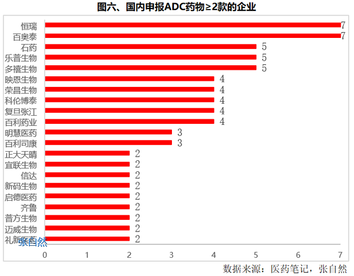 目前,申报ADC药物最多的是恒瑞和百奥泰,都有7个。