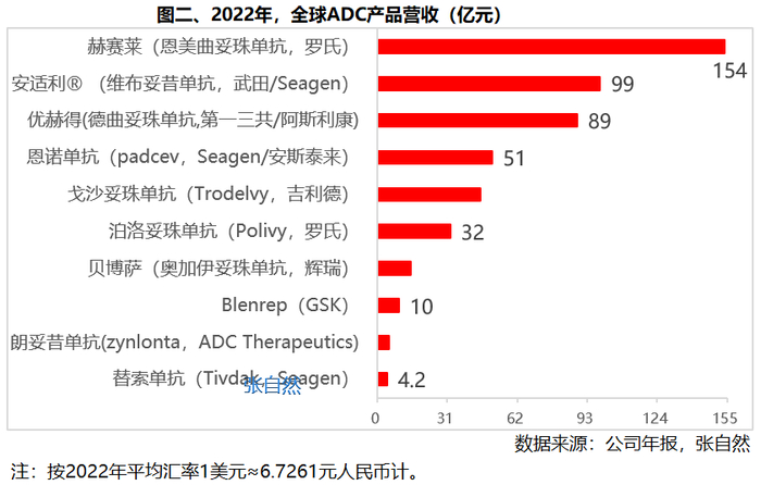 2022年,营收最高的是罗氏的赫赛莱(恩美曲妥珠单抗),实现销售22.88亿美元,折合人民币154亿元,也是唯一年营收过百亿的ADC。