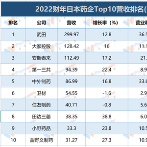 武田2022财年全年收入40,275亿日元(约合299.97亿美元),同比增长12.8%,排名第1,营业利润4906亿日元(36.54亿美元)同比增长6.4%。