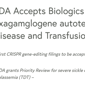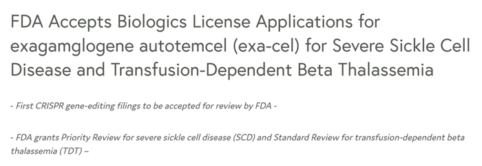 2023年6月8日,Vertex Pharmaceuticals 和 CRISPR Therapeutics 宣布,美国食品药品监督管理局(FDA)接受CRISPR基因编辑疗法exagamglogene autotemcel(exa-cel)治疗严重镰状细胞病(SCD)和输血依赖性β-地中海贫血(TDT)的生物制品许可申请(BLA),同时授予其治疗SCD的优先审评资格。