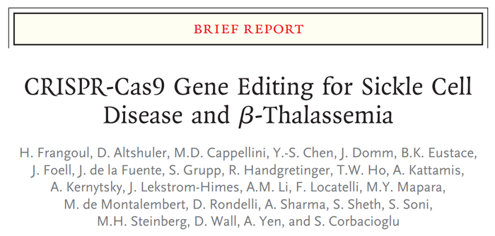 exa-cel疗法的临床试验数据此前于2020年12月发表在了《新英格兰医学杂志》(NEJM),论文题为:CRISPR-Cas9 Gene Editing for Sickle Cell Disease and β-Thalassemia。