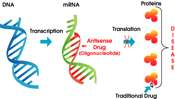 虽然市场上绝大多数传统药物的靶点是蛋白质,但反义药物靶点的是RNA。它们是经过化学修饰的核酸聚合物,依靠Watson-Crick碱基对与目标mRNA结合,导致基因沉默、立体阻碍、或替代剪接。