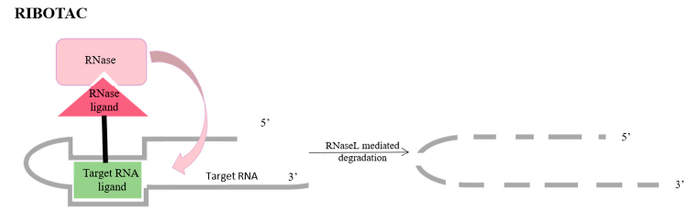 最近,斯克里普斯海洋研究所的迪斯尼教授发明了核糖核酸酶靶向嵌合体(RIBOTAC)。RIBOTAC是一个异质功能分子,用连接物连接核糖核酸酶配体和RNA配体。它能特异性地将内源性核糖核酸酶RNase L招募到特定的RNA靶点,然后利用细胞内核酸裂解机制(RNase L)成功消除RNA。