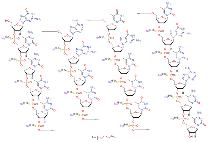 为了增加其稳定性和亲和力,米泊美森上的一个磷酸P-O键被修改为P-S键。此外,核糖单元上的2′-OH被修饰为2′-O-MOE取代基。但是,米泊美森已经遇到了肝脏和心血管安全问题。尽管它是FDA批准的早期ASO药物之一,但它在商业上是失败的。