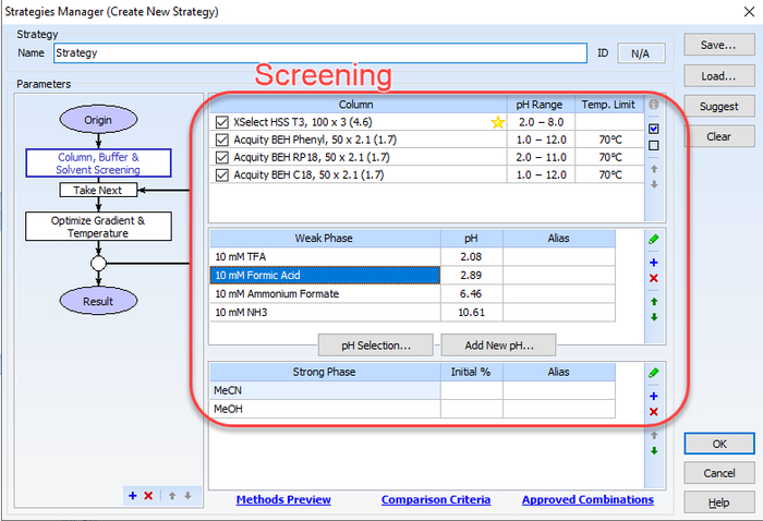 在筛选策略的制定时,通常需要探索对分离选择性较大的因素,如色谱柱种类,流动相pH和强洗脱种类。