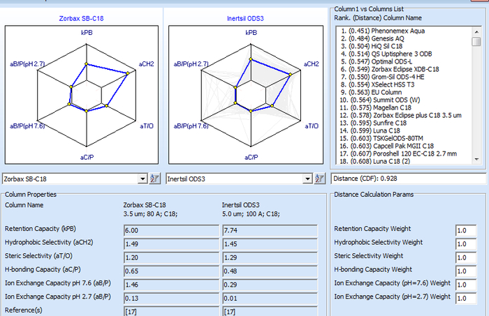 ACD/Labs提供Eureby 和 Peterson的色谱柱评估方法和色谱柱数据库。Eureby等基于田中柱效测试,对色谱柱的保留能力,疏水选择性,立体选择性,氢键能力,酸性条件下的离子交换能力,碱性条件下的离子交换能力进行定量。让色谱工作者能够更加简便就能获知色谱柱的特性和能力。