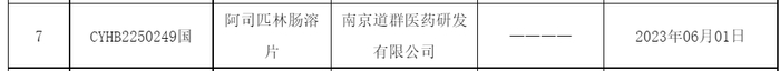6月7日,NMPA发布2023年06月07日药品批准证明文件送达信息,其中南京道群医药研发有限公司的阿司匹林肠溶片以补充申请的形式通过一致性评价,为国内第4家!