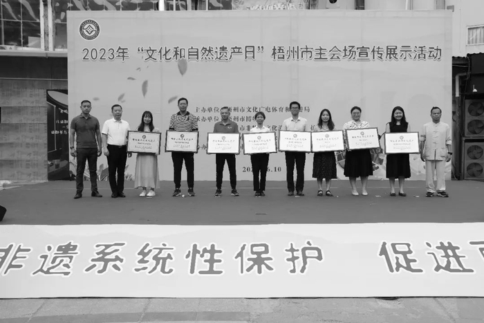 6月10日,梧州市举办2023年“文化和自然遗产日”宣传展示活动,市文广体旅局对第六批市级非遗代表性项目保护单位代表颁发项目牌匾。(图左六为梧州制药党委委员、副总经理程智宁代表领奖)